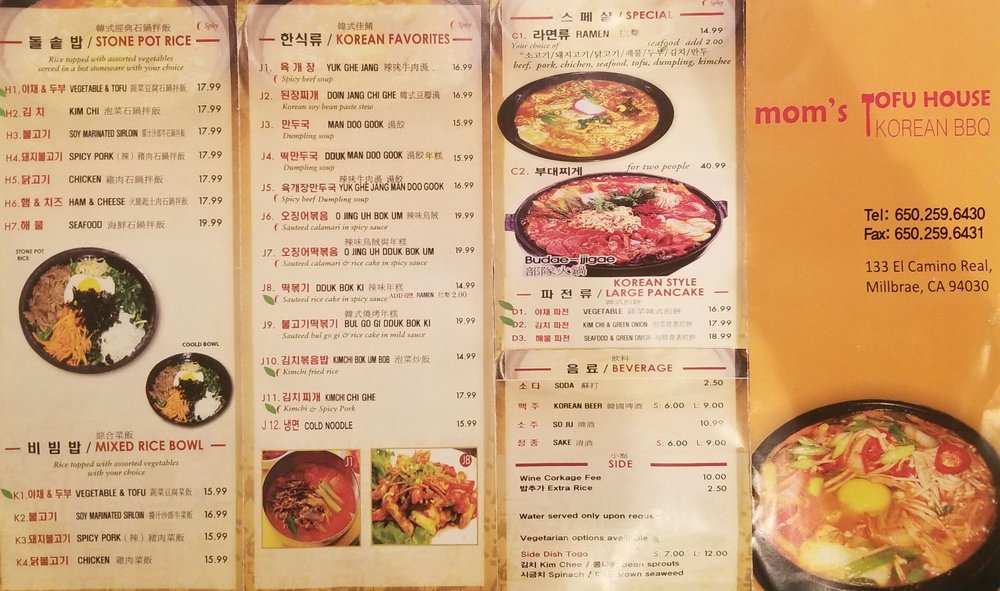Welcome to Mom's Tofu House, a cozy gem tucked away in Millbrae that serves up delightful Korean flavors. While the name suggests a focus on tofu, this eatery has pivoted towards an enticing array of barbecue and traditional offerings. The menu features standout items, such as the marinated Galbi and spicy Daiji Bulgogi, both perfect for lunch. Don't miss the appetizers like the crunchy Seafood Pancake and flavorful Kimchi Pancake, which receive rave reviews for their generous portions and mouthwatering tastes.